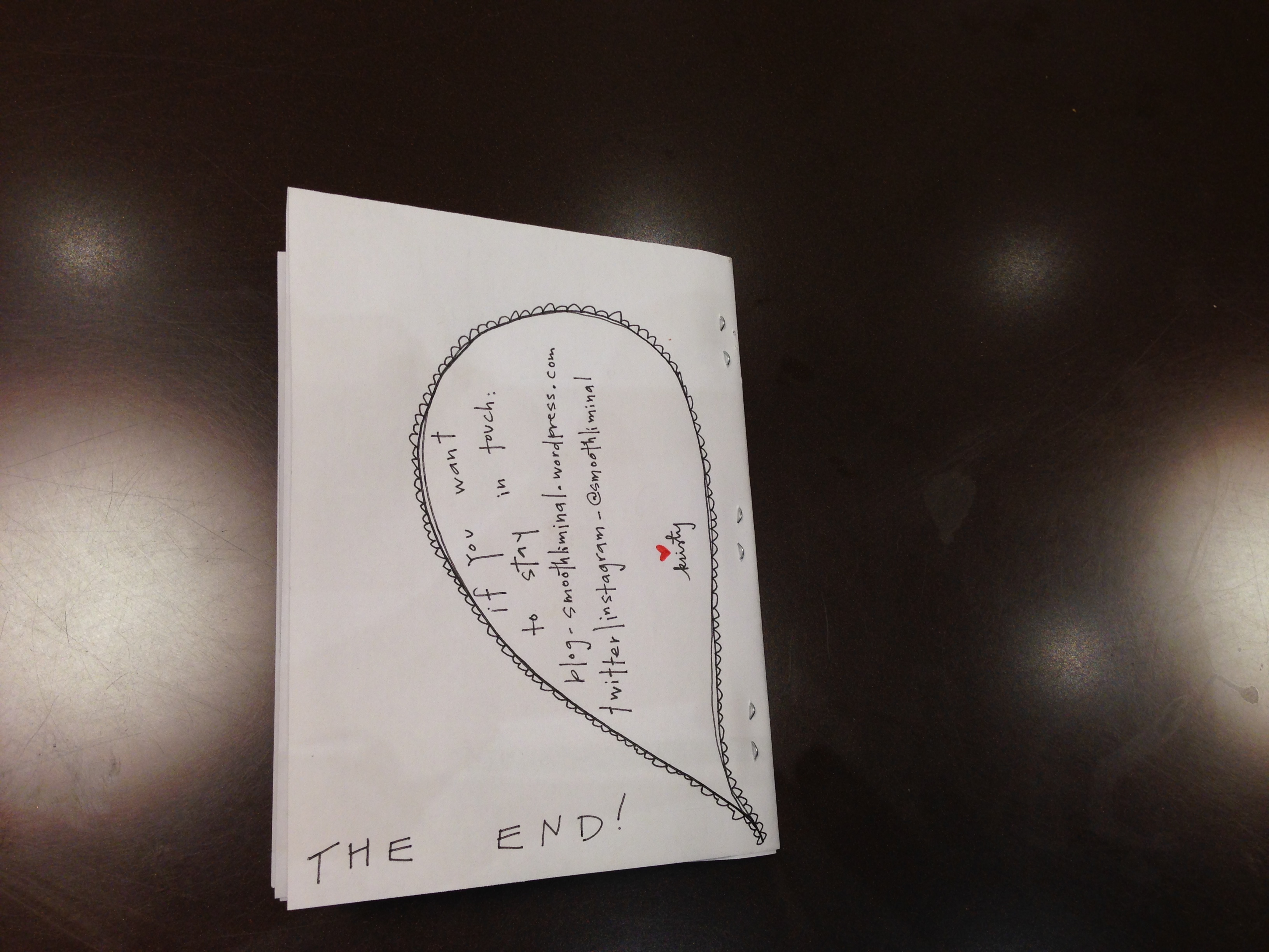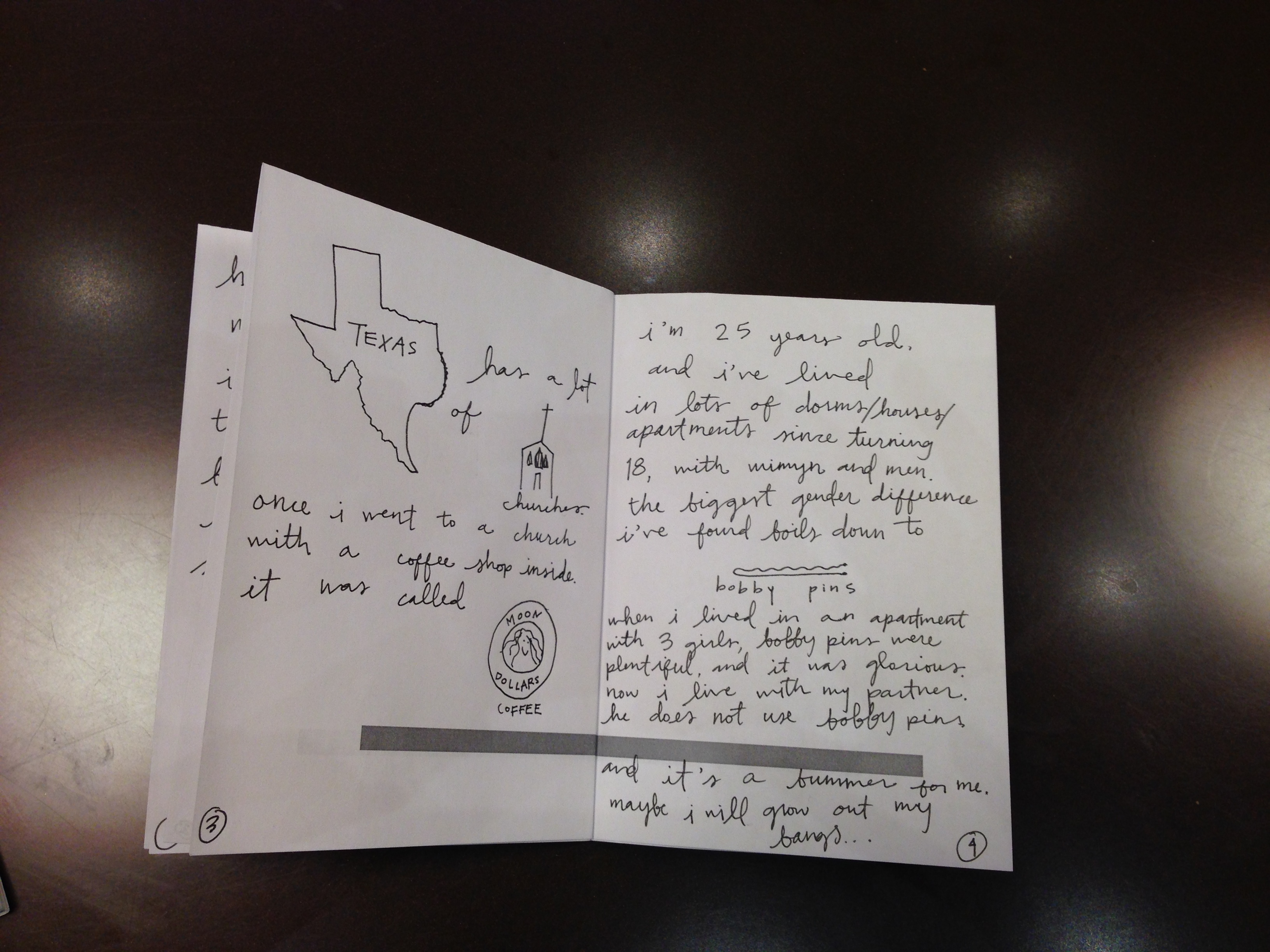 Originally, I had planned on making photocopies, but since I left it until the absolute last minute, all I have are these phone photos that I took at the Au Bon Pain where I made it. I’ve never really eaten there, but I highly recommend it as a public space. In the thirty minutes it took me to make this, I watched a very awkward job interview (“Were you fired from your last job?” “…Yes.” “Did you get along with your co-workers?” “…No.”) and a very speedy break-up (it was dramatic and loud but also so fast).